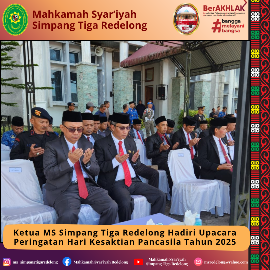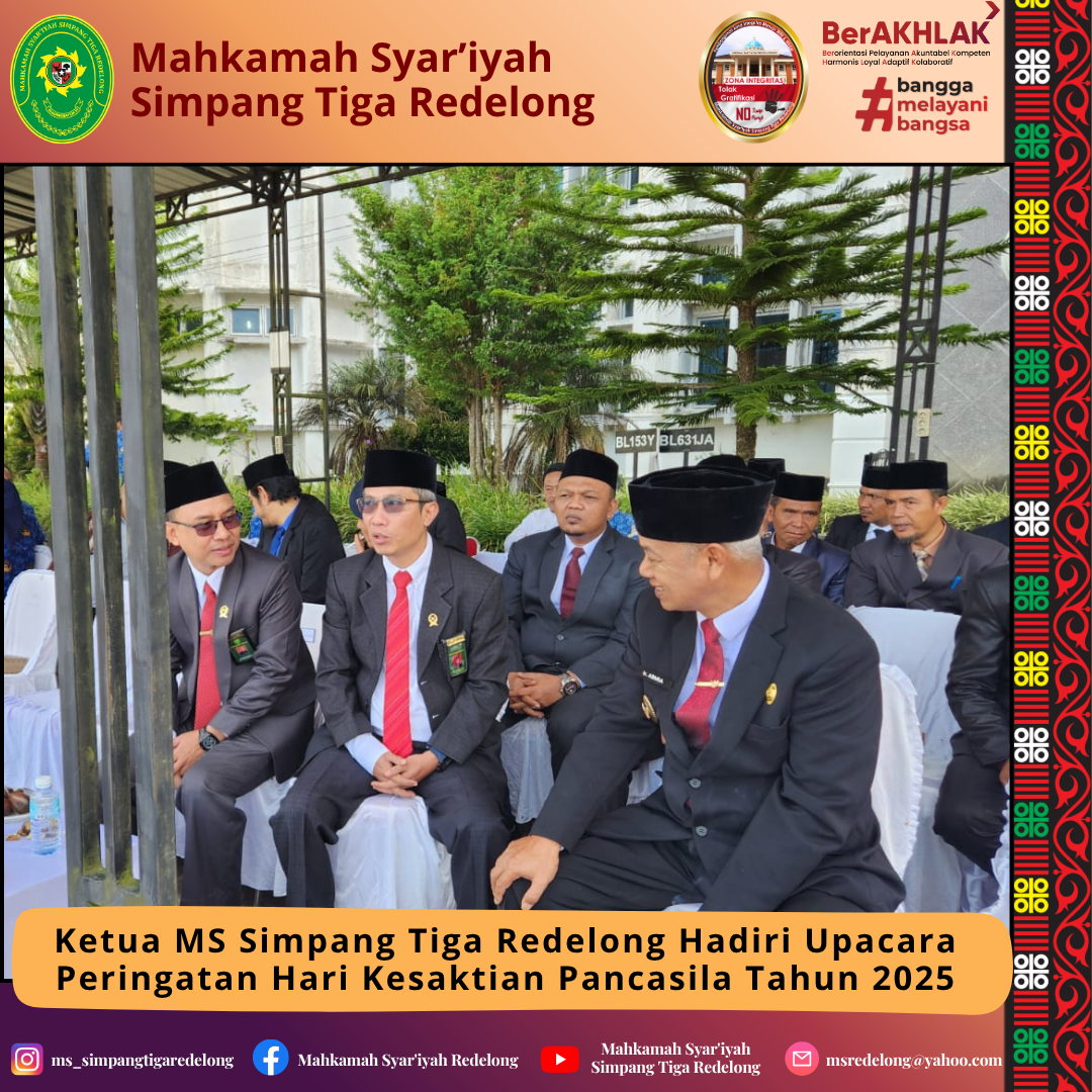 Redelong, Rabu 1 Oktober 2025 – Ketua Mahkamah Syar’iyah Simpang Tiga Redelong, Bapak Ahmad Nazif Husainy, S.H., menghadiri Upacara Peringatan Hari Kesaktian Pancasila Tahun 2025 yang digelar di Lapangan Upacara Sekretariat Daerah Kabupaten Bener Meriah. Upacara tersebut dipimpin langsung oleh Ir. H. Armia, Wakil Bupati Bener Meriah, yang bertindak sebagai Inspektur Upacara.