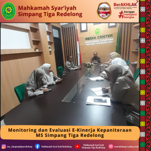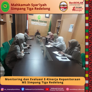 Redelong, Kamis 16 Oktober 2025 — Mahkamah Syar’iyah Simpang Tiga Redelong melaksanakan kegiatan Monitoring dan Evaluasi (Monev) E-Kinerja Kepaniteraan yang berlangsung pada hari Kamis, 16 Oktober 2025. Kegiatan ini dihadiri oleh Ketua MS Simpang Tiga Redelong, Bapak Ahmad Nazif Husainy, S.H., Panitera Ibu Sukna, S.Ag., serta para Panitera Muda dan staf kepaniteraan.