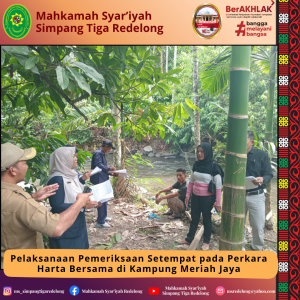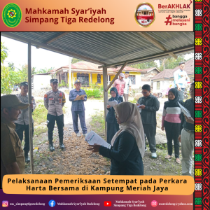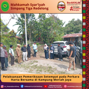 Redelong, Selasa 30 September 2025 – Mahkamah Syar’iyah Simpang Tiga Redelong melaksanakan Discente (Pemeriksaan Setempat) terhadap perkara harta bersama dengan nomor perkara 205/Pdt.G/2025/MS.Str. Pemeriksaan ini dilaksanakan di Kampung Meriah Jaya, Kecamatan Gajah Putih, Kabupaten Bener Meriah, pada hari Selasa, 30 September 2025. Adapun objek yang diperkarakan meliputi dua objek, yaitu tanah dan bangunan (satu objek) serta sebidang tanah (satu objek). Pemeriksaan dilakukan langsung di lokasi untuk memastikan kejelasan objek sengketa.